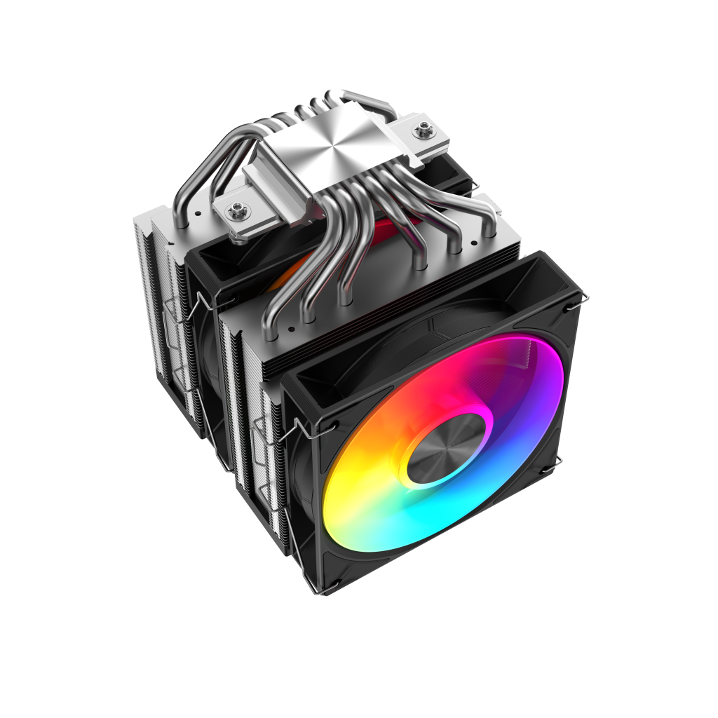 This premium cooler showcases a minimalist design with a top cover integrated with ARGB light strips, paired with dual 120mm guide ring fans that deliver powerful yet quiet cooling.