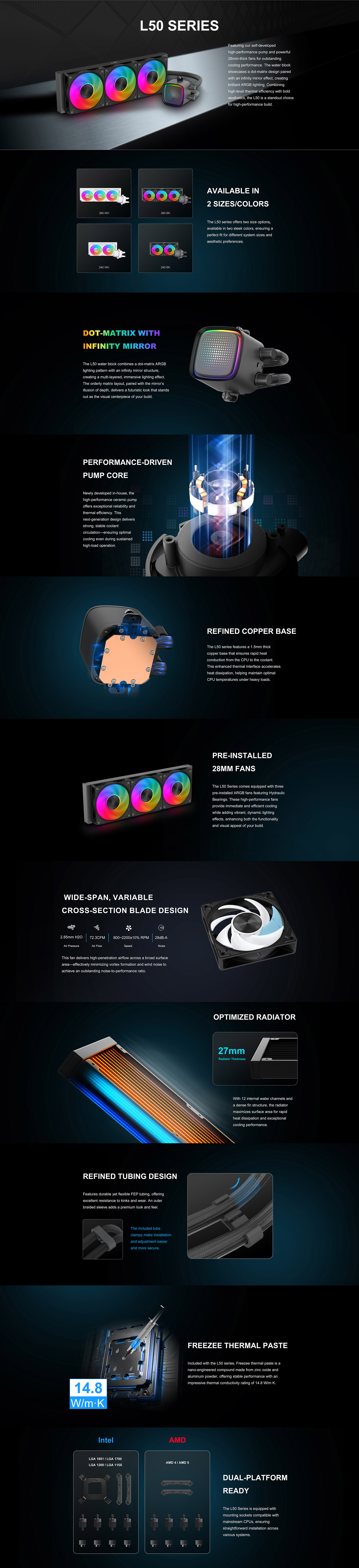Introducing the SAMA L50 AIO: equipped with a self-developed high-performance pump and 28mm-thick fans for exceptional cooling. Its dot-matrix water block with infinity mirror effect delivers stunning ARGB lighting—blending high-level performance with bold aesthetics.